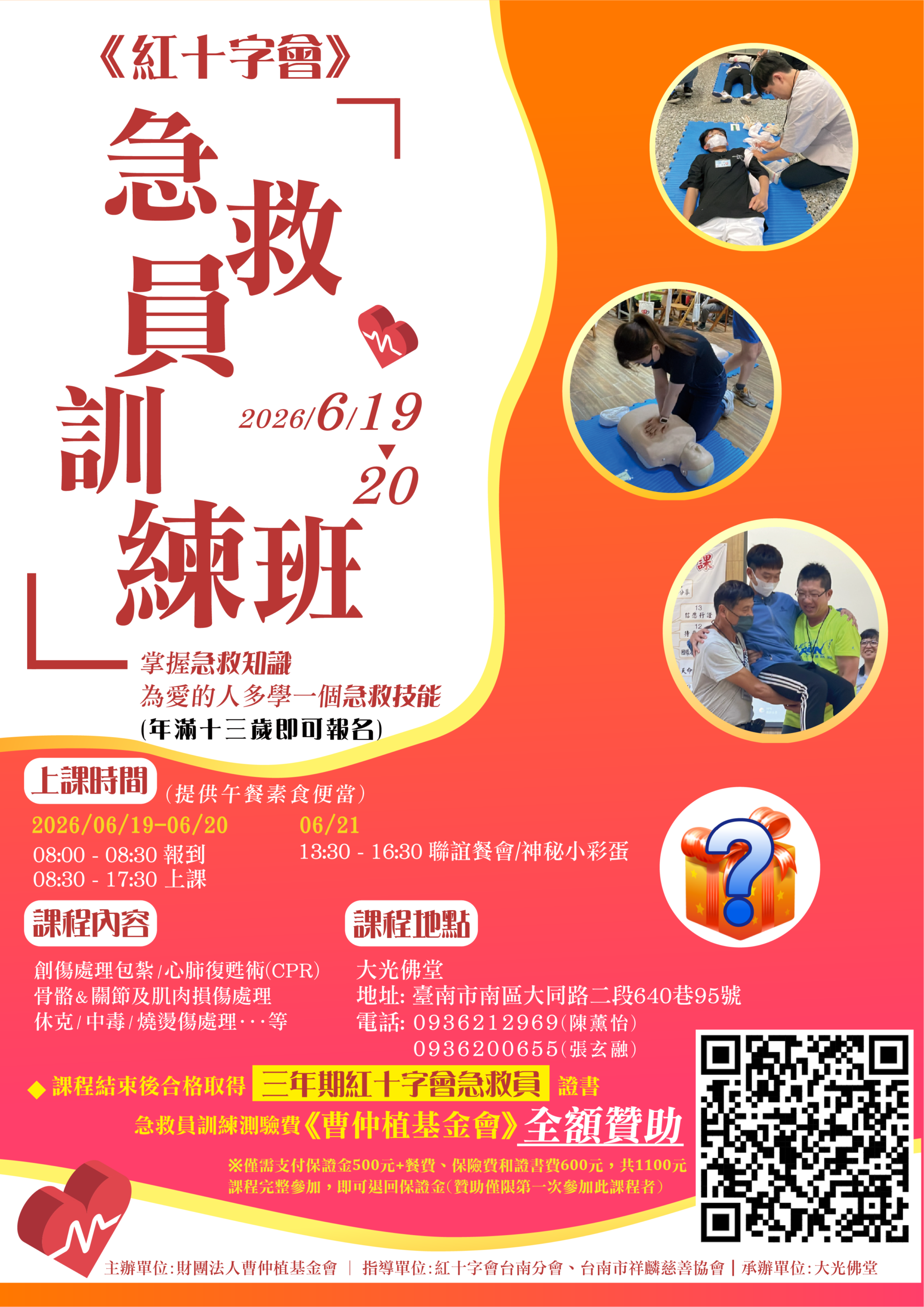 本課程將由專業師資帶領,從基礎觀念到實際操作,完整學習:✔ CPR心肺復甦術✔ AED自動體外電擊器使用✔ 異物哽塞處理(哈姆立克法)✔ 常見緊急狀況應對